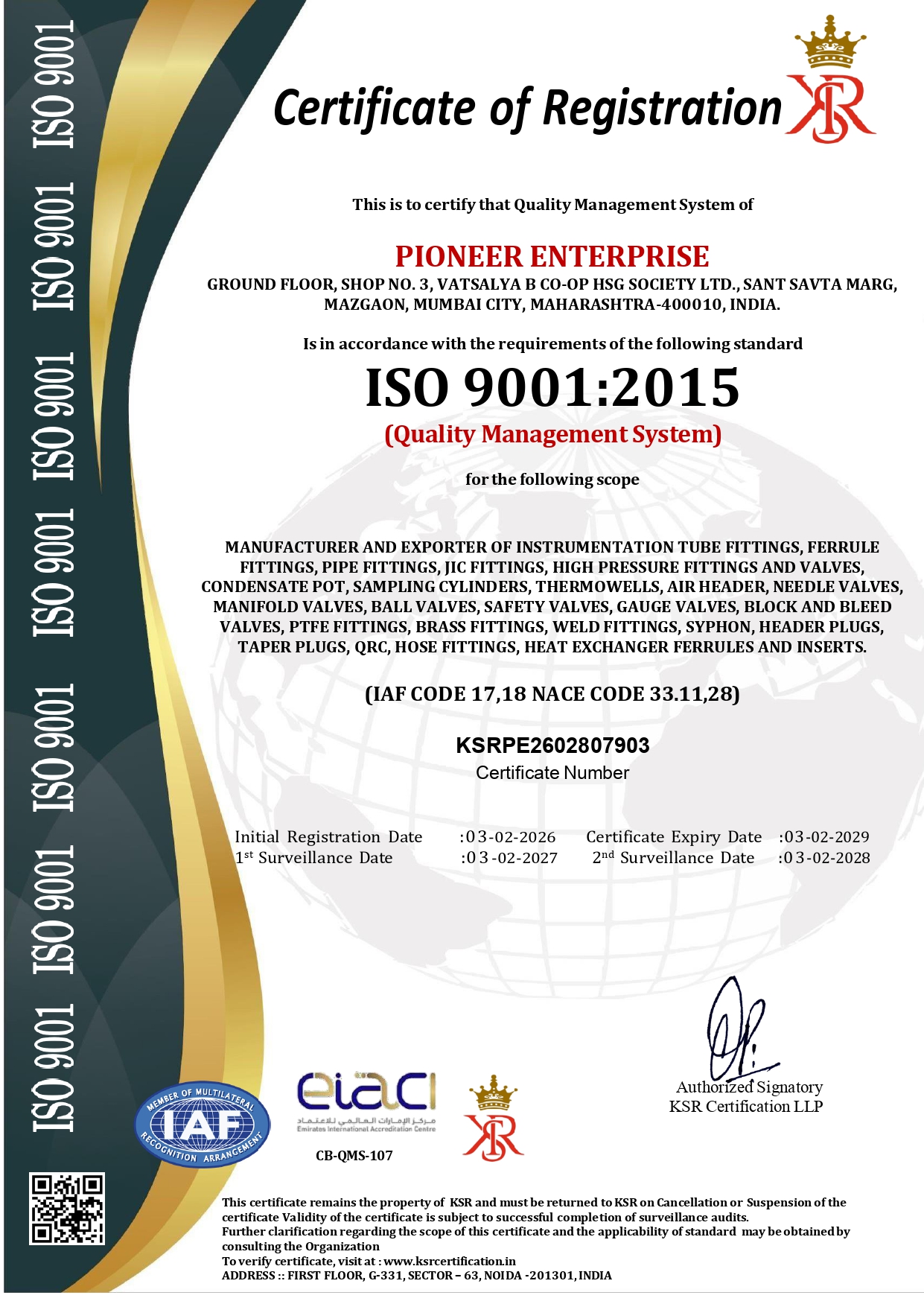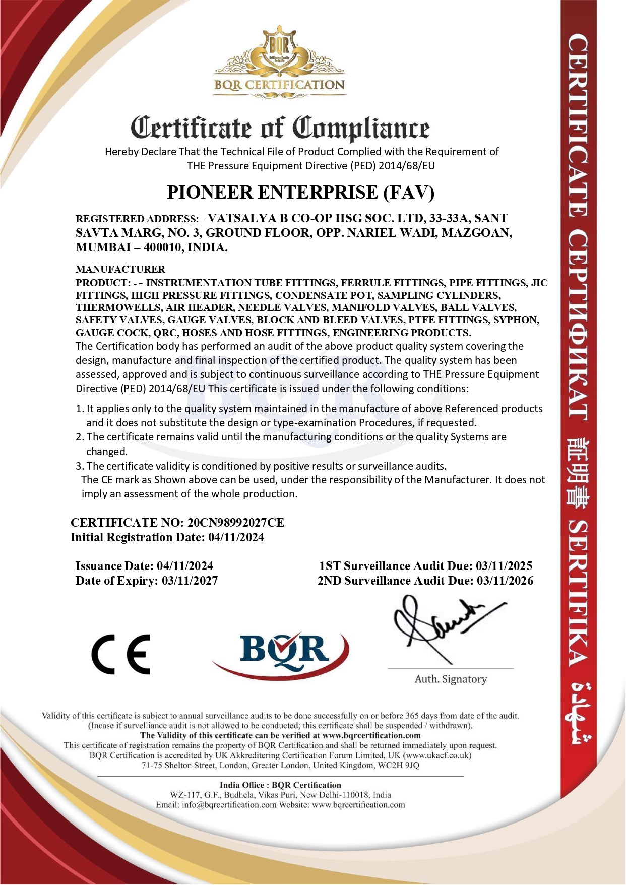 FAV confirms to latest ISO 9001-2015 and all the products pass conformity as per Pressure Equipment Directive (PED) 2014/68/EU , making it CE Compliant  .Other certificates will be sent on request .