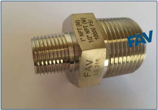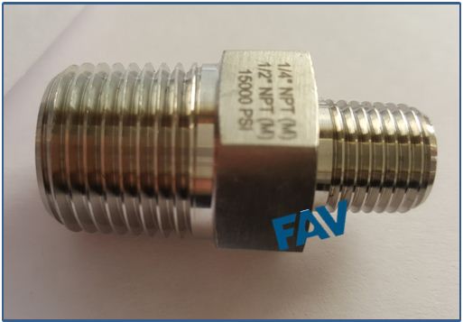 FAV is the manufacturer of High Pressure Hex Reducing Nipple in 10000 psi , 700 Bars. It has NPT Male Connection on both sides .